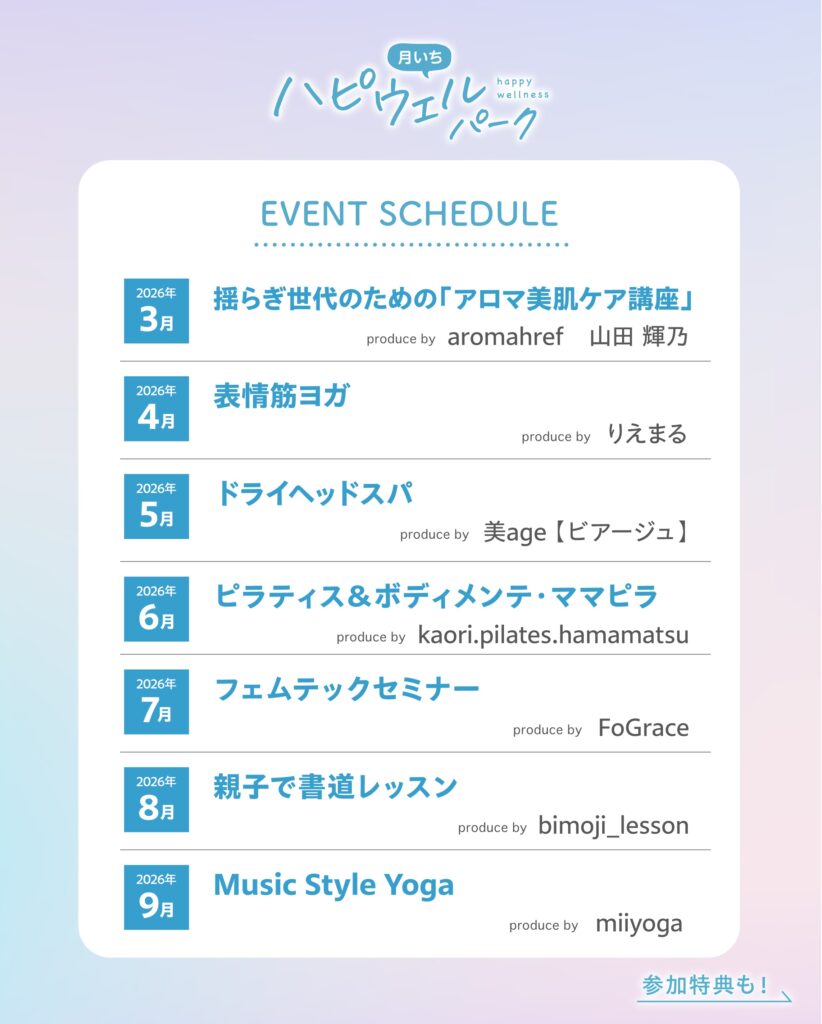 毎月、浜松市を中心に活躍する講師の方々をお招きし、心と身体のケアや学びを深められる多彩な内容をご用意しています。