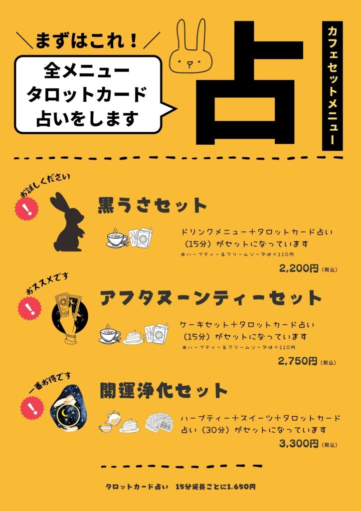 占いがセットになったメニューはこちら。それぞれ①タロットカード占い+ドリンク②タロットカード占い+ケーキセット③タロットカード占い+ハーブティー+スイーツとなっています。
